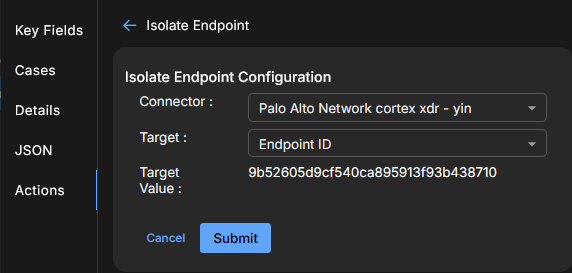 You can isolate an endpoint on Palo Alto Networks CORTEX XDR. You must have previously configured a connector to that service in order to perform this action. You can also unisolate an endpoint.