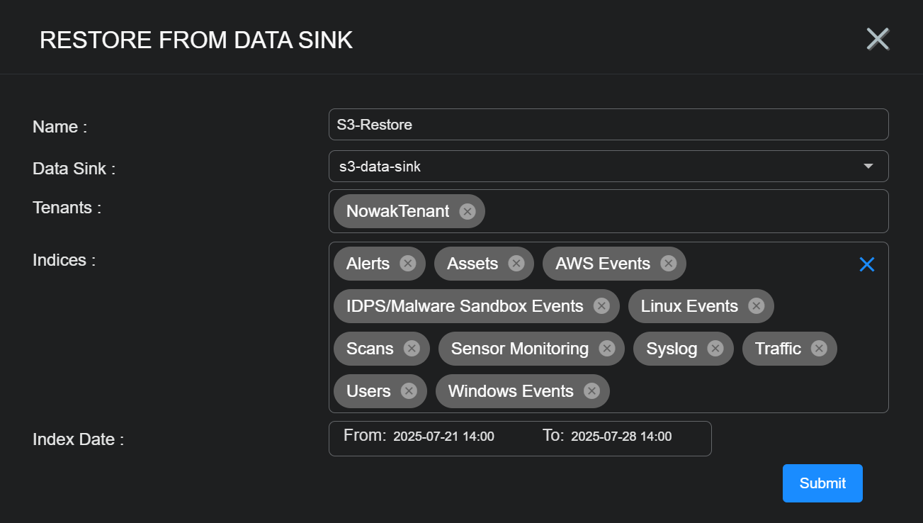 The System | DATA MANAGEMENT | Data Management | Data Sink Restore tab lets you restore data from storage in a Data Sink. You can filter the import on a combination of Tenants, Indices, and a date range.