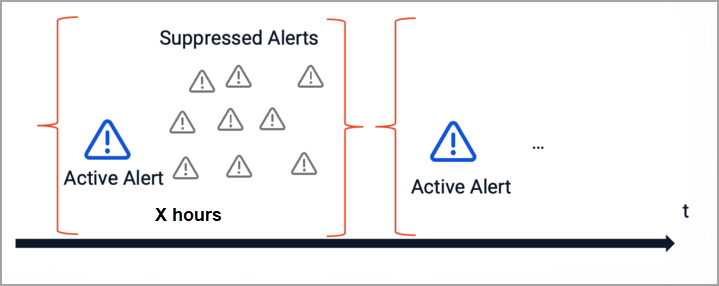 This section further explains the alert suppression process summarized in the sentence: To minimize excessive alerting, each alert type is triggered only once in a configurable period (from 1 to 24 hours) for the set of attributes that triggered that specific alert.