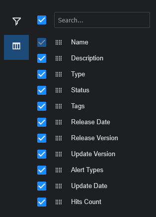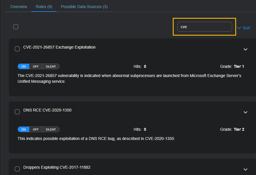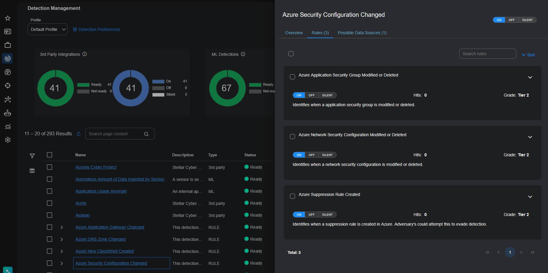 Benefit—Offers granular control over the activation state of all detection types (On, Off, or Silent), and comprehensive visibility into the performance of each detection through hit statistics.