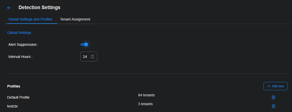 ) at the top right of the Detection Management page to open the Detection Settings page to the Global Settings and Profiles tab. Use this tab to configure global settings as well as profiles for multi-tenancy.
