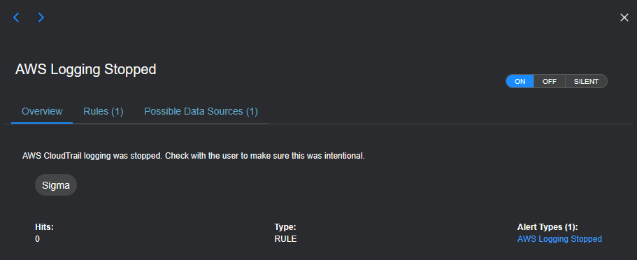 Silent—detections are active but do not produce alerts when triggered, allowing for passive monitoring. Silent detections operate silently, gathering data and allowing for performance evaluation to ensure minimal false positives and optimal effectiveness.