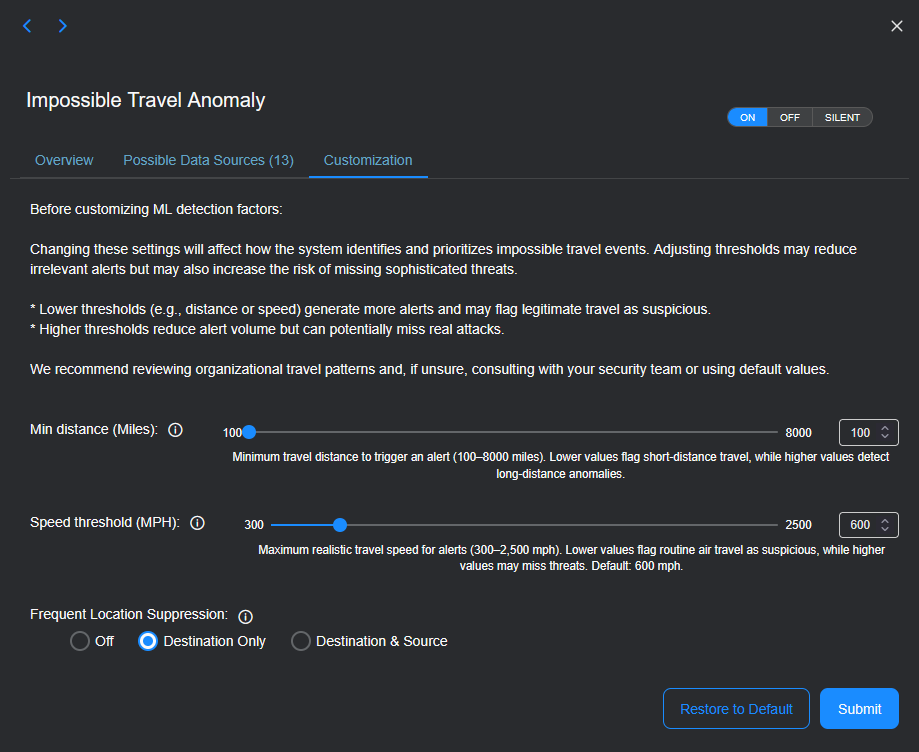 For Impossible Travel Anomaly, you can customize the minimum distance and speed thresholds, and select the frequent location suppression.