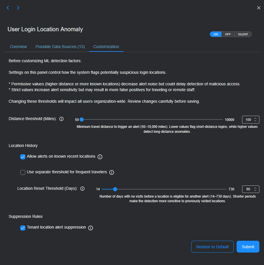 For User Login Location Anomaly, you can customize the distance threshold, the behavior for previously visited locations, and rules for tenant-level location suppression.