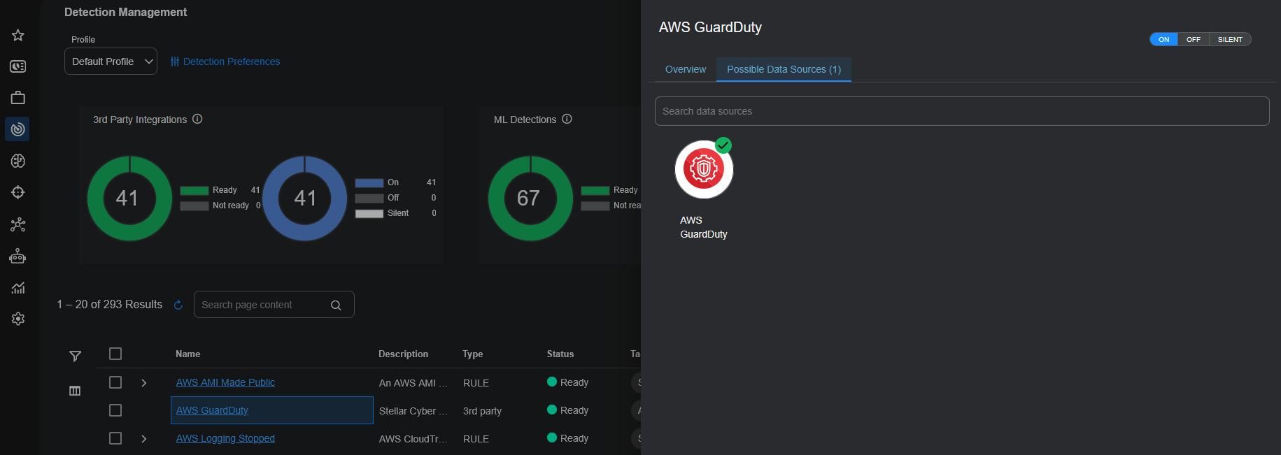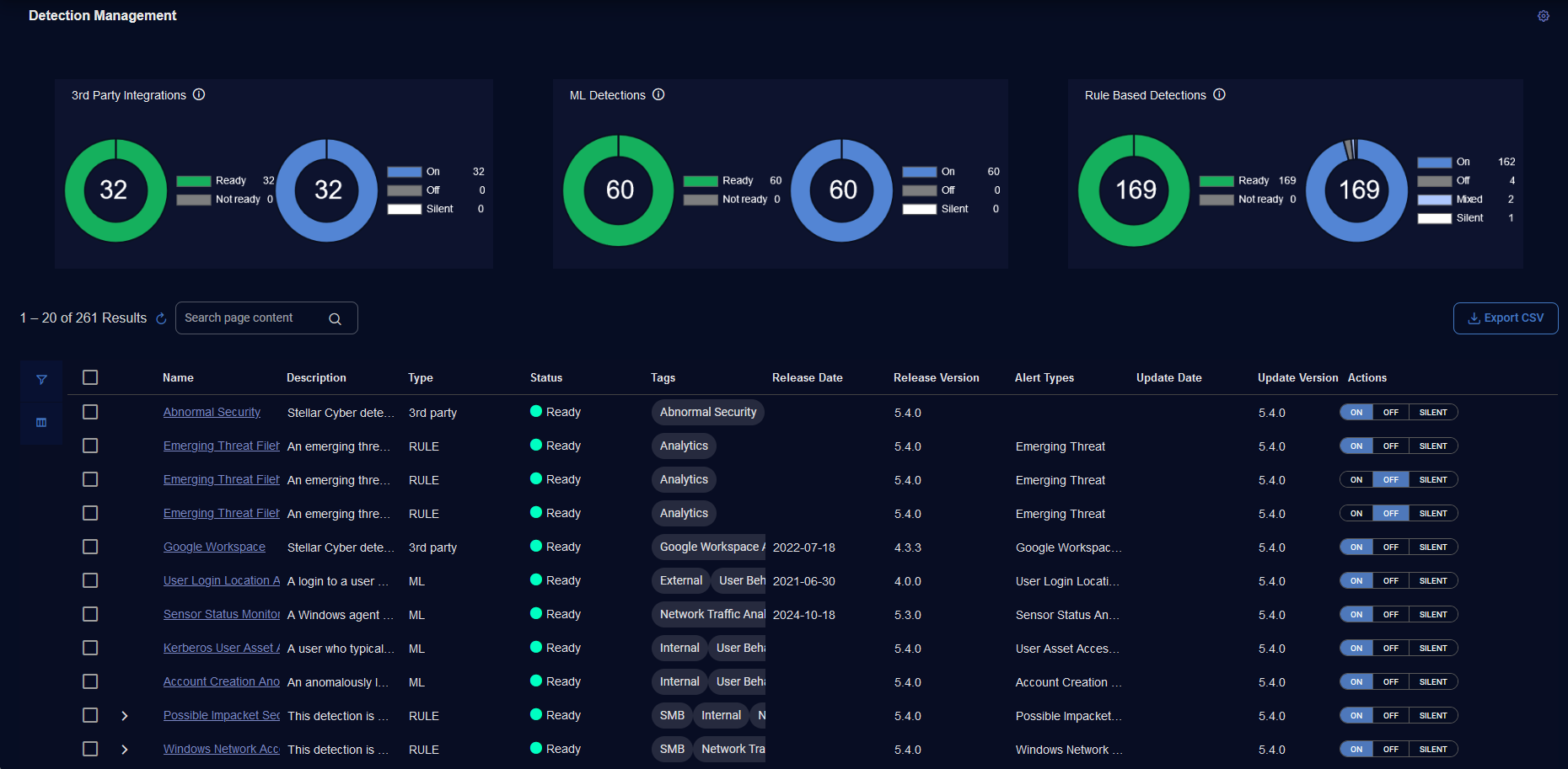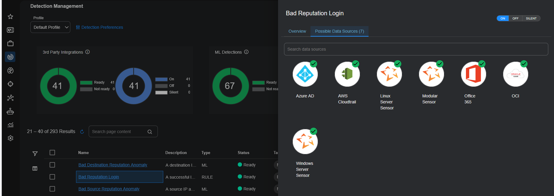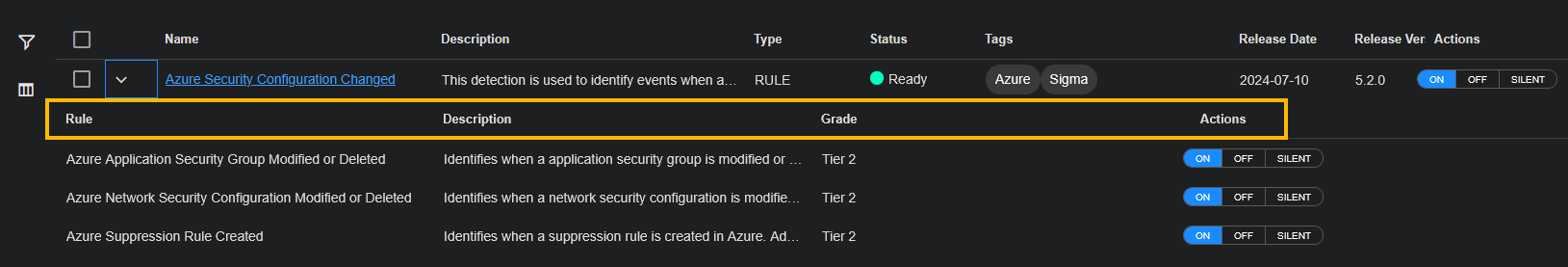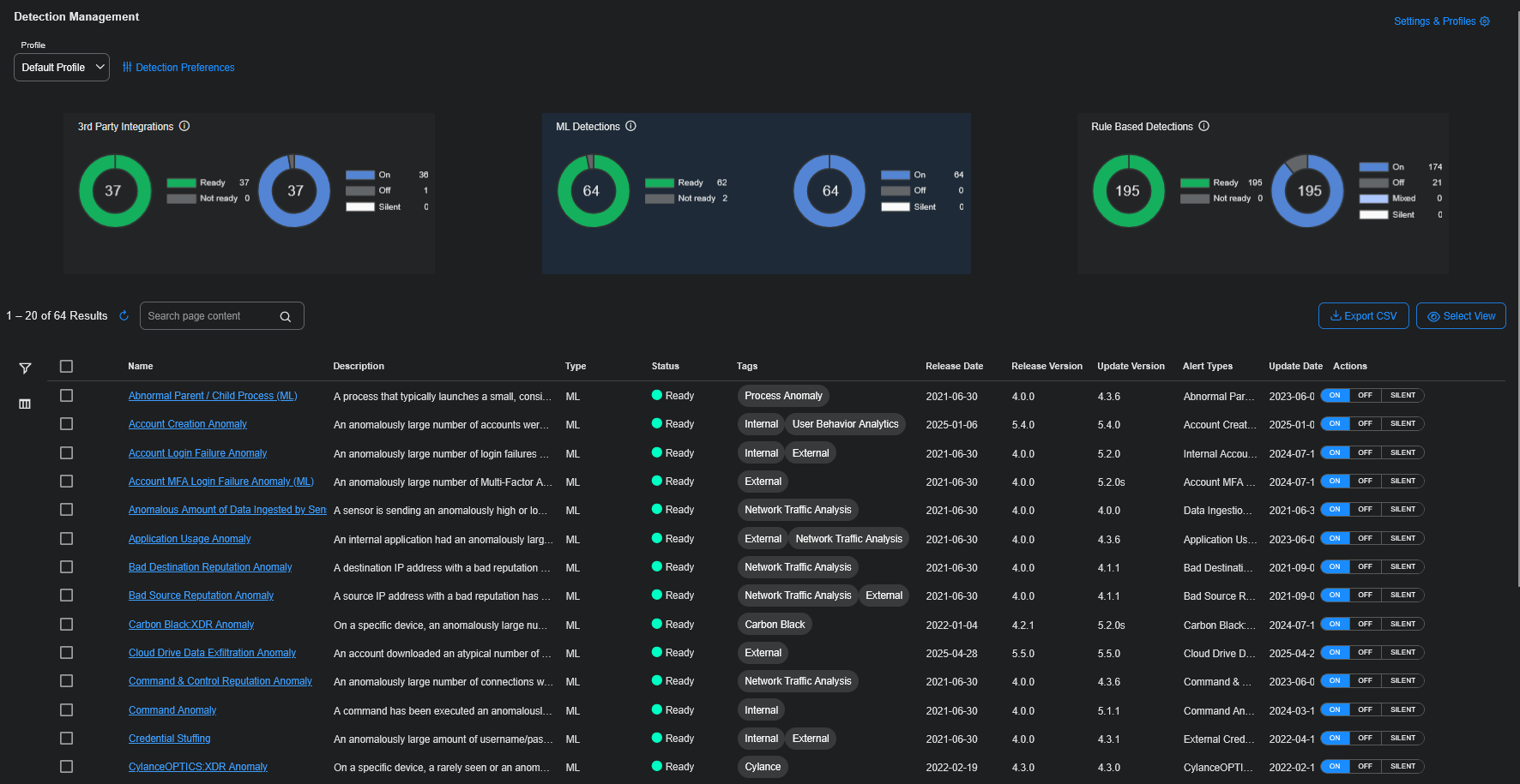 Actions—Actions for 3rd Party Integrations, ML Detections and Rule Based Detections to toggle an alert type ON, OFF, or SILENT.