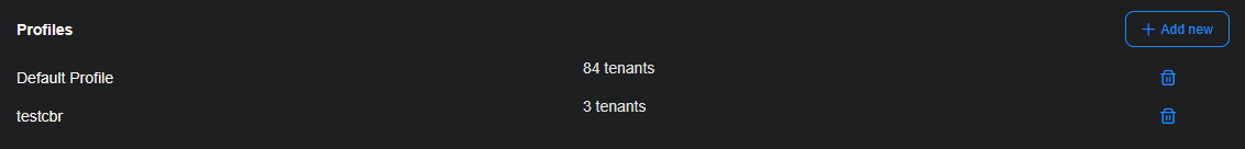 You can assign several tenants to one profile, with those tenants sharing the same settings, or you can create unique profiles for specific tenants. The maximum number of profiles is 30. Each tenant can only be assigned to one profile.