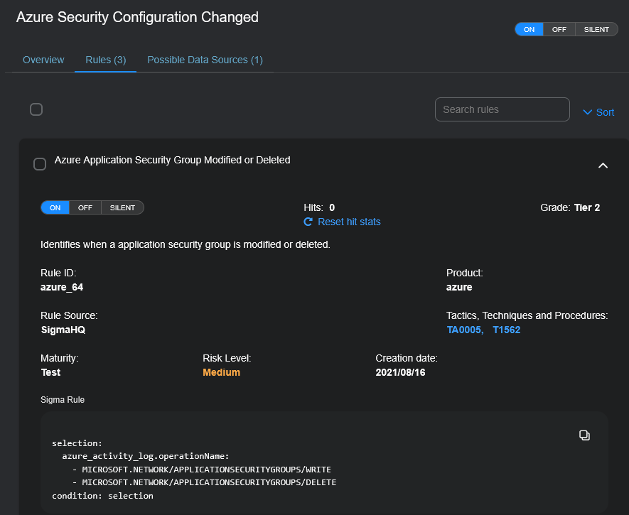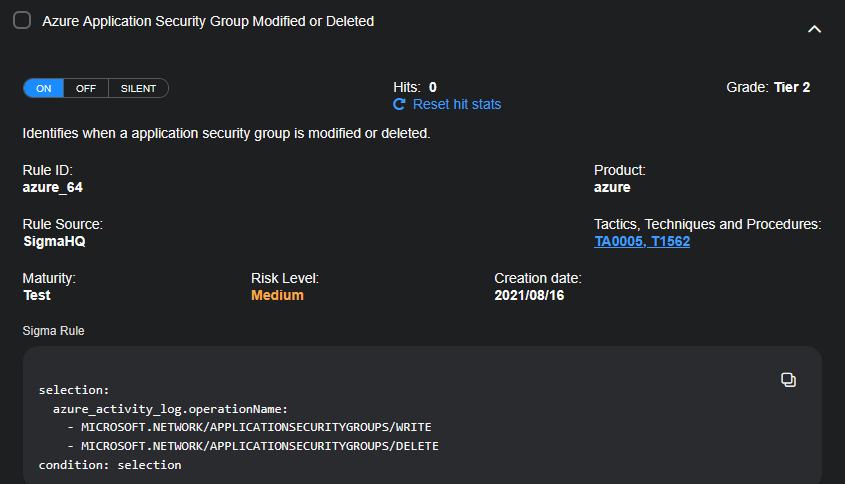 Hits Count—Number of times the detection was triggered (or would have been triggered for Silent mode) over the past seven days.