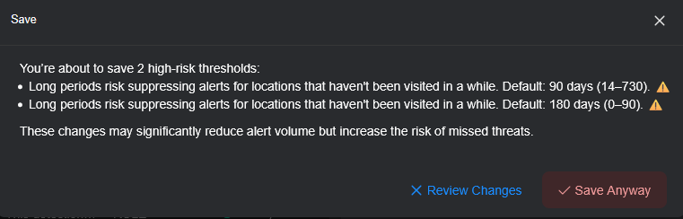 Use the slider to change the Location Reset Threshold (Days): This sets the number of days with no visits before a location is eligible for another alert. This is the number of days without a visit that must pass before the system can generate another alert for a known location. This threshold applies to all users if separate thresholds are disabled and it applies to stationary users if it is enabled. This helps reduce alert fatigue from repeated logins at the same location. The default is 90 days. The minimum is 14 days. The maximum is 730 days. Shorter periods make the detection more sensitive to previously visited locations. Very short periods may incur alerts for known locations. Long periods risk suppressing alerts for locations that have not been visited in awhile.