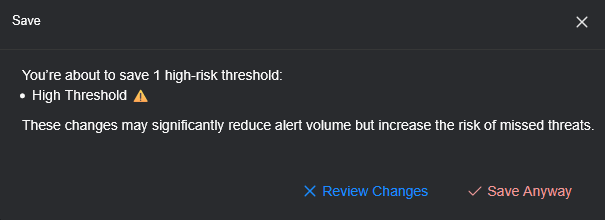 Use separate threshold for frequent travelers:Enable this threshold to apply different alert rules for users who travel often. This helps reduce false positives for frequent travelers while maintaining stricter rules for stationary users.