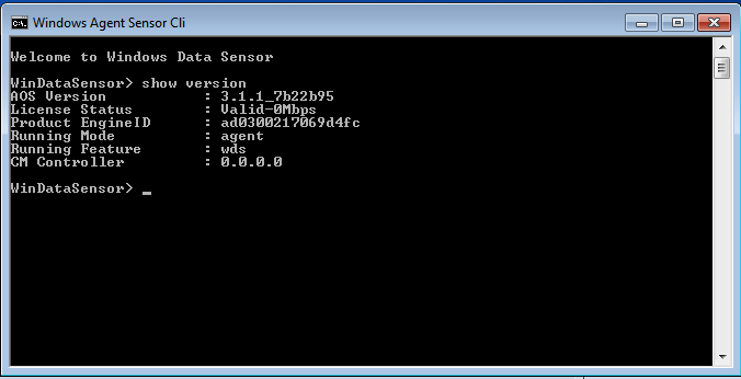 After starting the Windows Server Sensor CLI, a terminal window appears as below. This window lets you enter CLI commands to the Server Sensor. Enter the show version command to verify the functioning of the sensor. In response, the sensor displays output similar to the following: