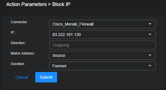 Stellar Cyber prepopulates the configuration wizards for case actions with the data corresponding to the case. For example, when configuring a Block IP action, the IP drop-down list automatically lists just those IP addresses associated with the case. You can always type in your own address, but the most relevant ones are already listed for you.