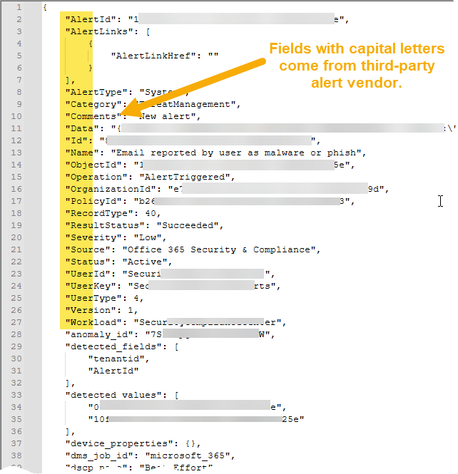 Keep in mind that in an on-premises deployment, any fields in an alert's Interflow that include capital letters come directly from the alert's vendor. For example, in the sample Interflow shown below, the fields in the first lines all include capital letters and all come from the alert's vendor (Microsoft, in this example).