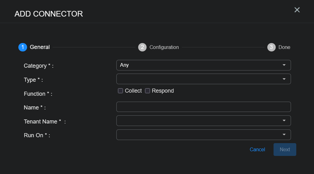 Adding and editing provide the same configuration options; the only difference is that you cannot edit the General configuration options. Click Create and select Connector to create a new connector or click