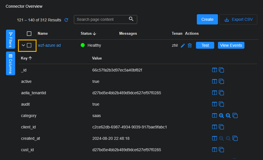 The table behaves like all other Stellar Cyber tables. You can change the displayed columns, sort by columns, and export the displayed list, for example. This table also includes a Last Activity column, which is the timestamp for the last successful activity for that connector.