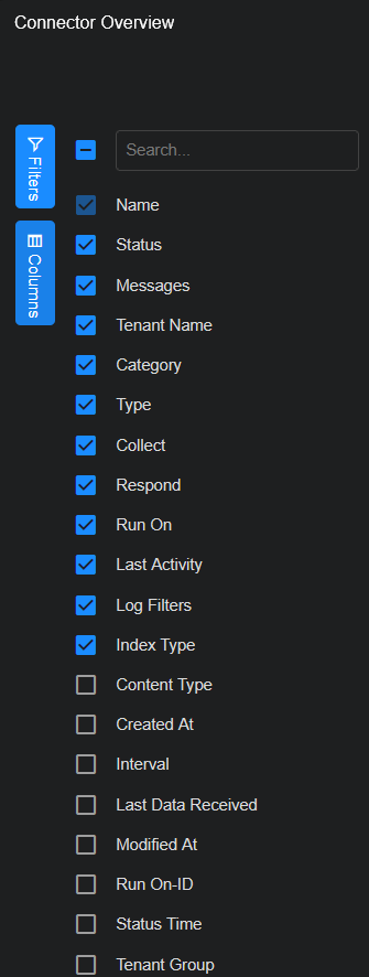 There are several columns in the Connectors table. To see the default columns, click the icon (