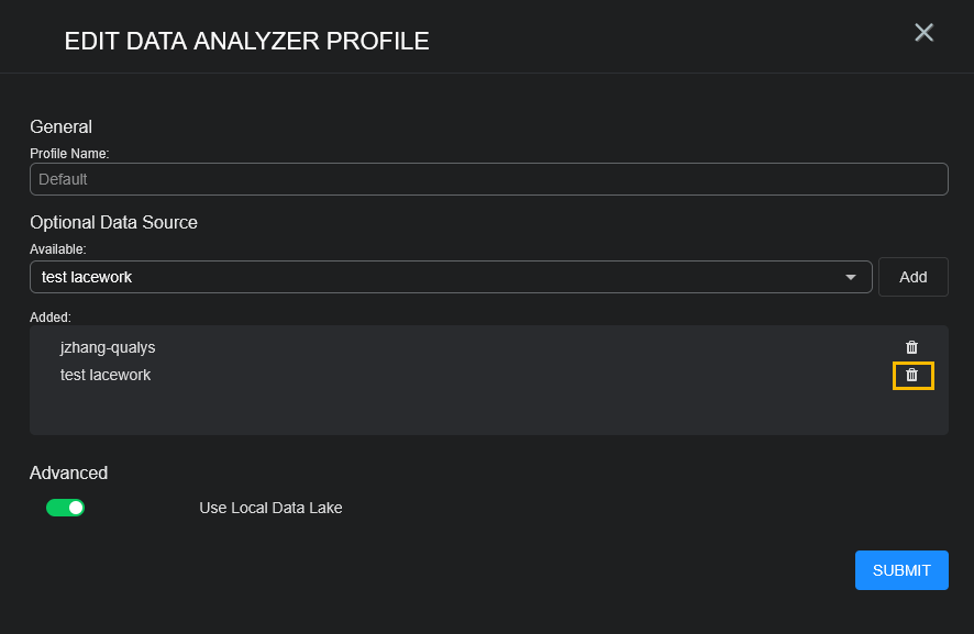 To delete a connector you must first remove it from the data analyzer profile (firewall and vulnerability scanner connectors are not included in data analyzer profiles, so can skip these steps):