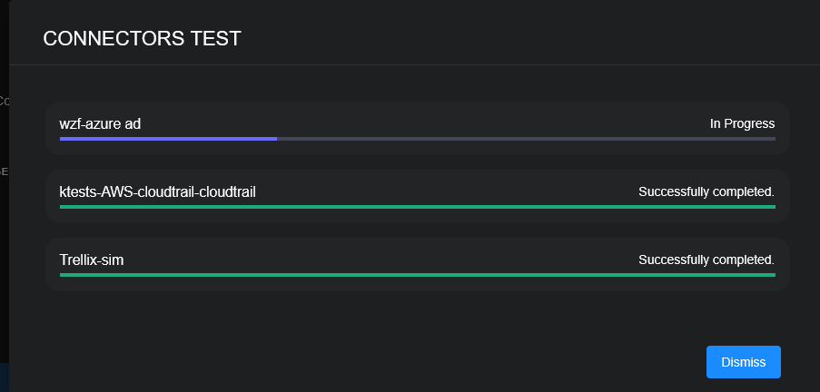 When you have the desired connectors selected, click the Test button in the heading row. The Connectors Test dialog is displayed, which shows the progress of each test. Also note that in the background, any running tests are displayed as In Progress.