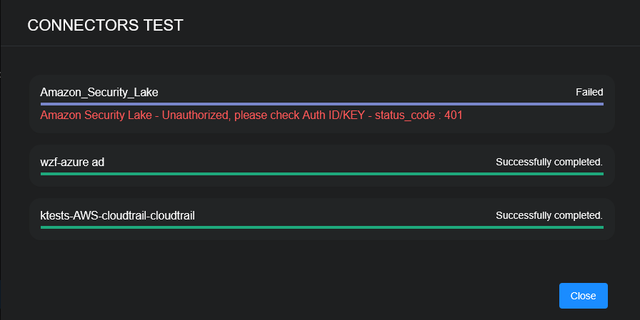 To aid troubleshooting your connector, the dialog remains open until you explicitly close it by using the X button. If the test fails, you can select the button from the same row to review and correct issues.