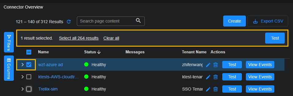 You can select several connectors to test them in bulk. You can select up to 10 connectors. Do not navigate away from the test page while the tests are running or the process may halt.