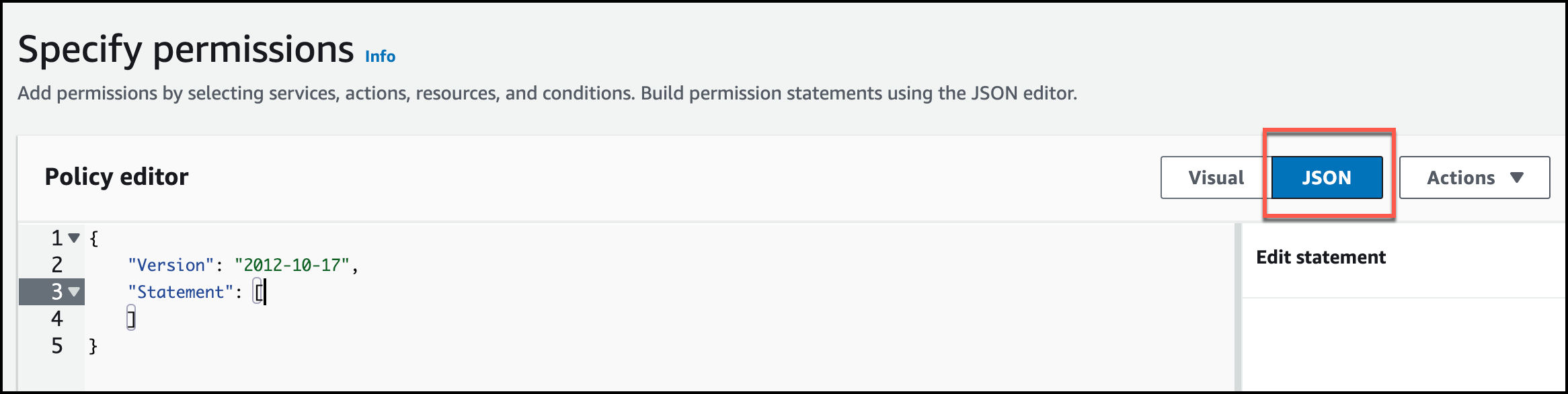 5. Using the example below as a guide, edit the JSON policy document.