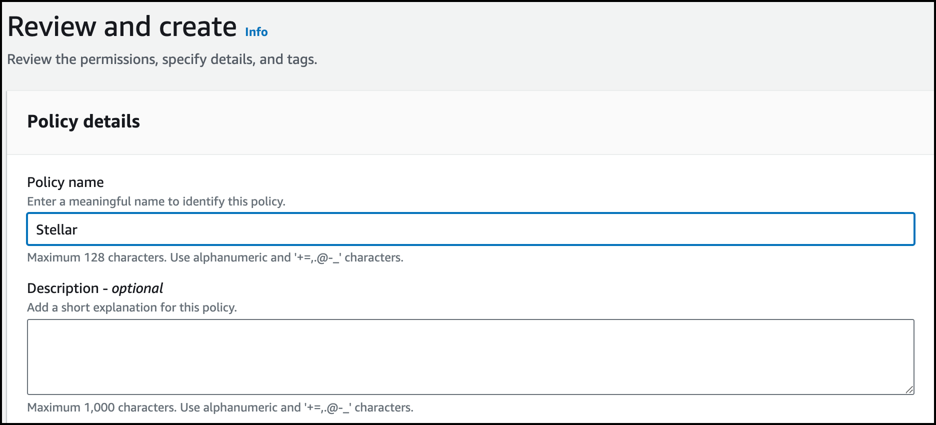7. Give your policy a name to associate it with Stellar Cyber, then choose Create policy.