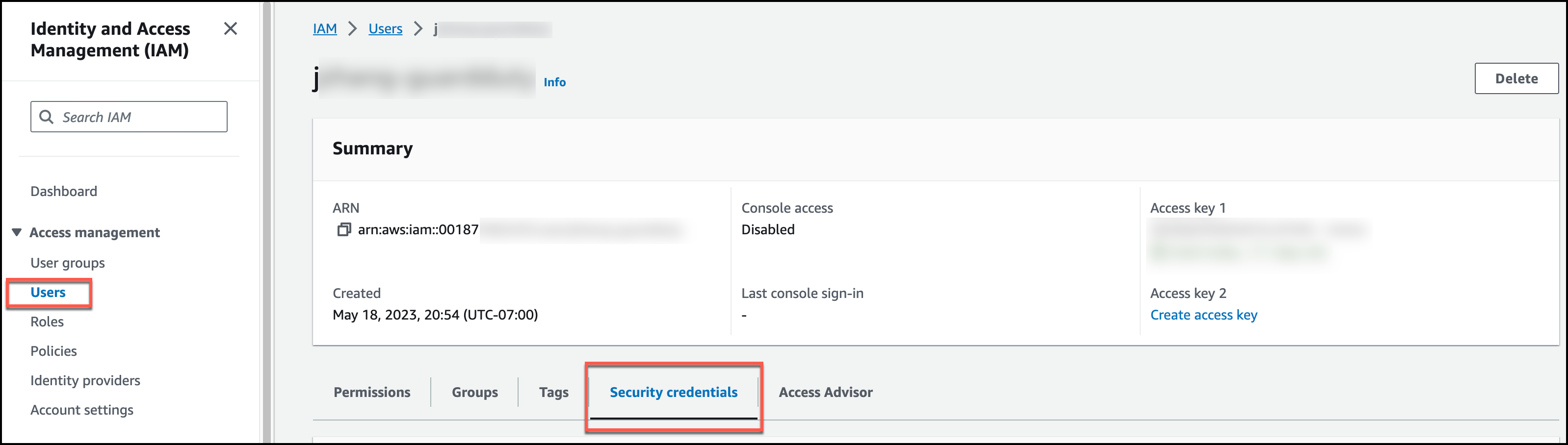 2. Choose Users, then click the user name, and click Security credentials.