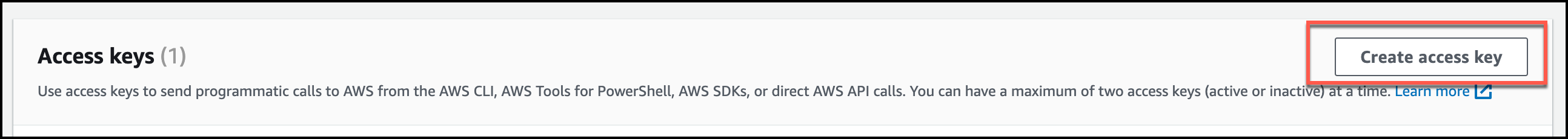 3. In the Access keys section, choose Create access key. Access keys have two parts: an access key and a secret access key. Click Create access key.