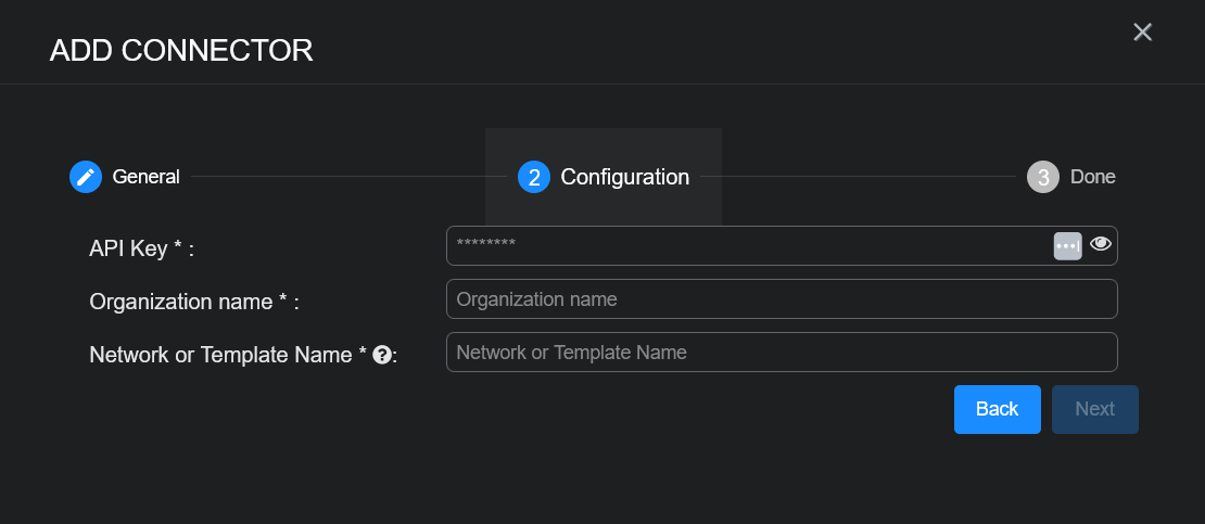 • API Key, Organization Name, and Network or Template Name