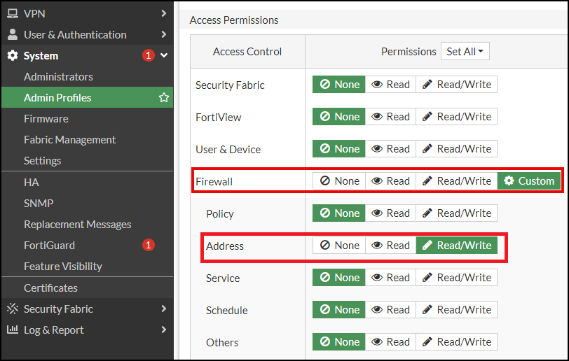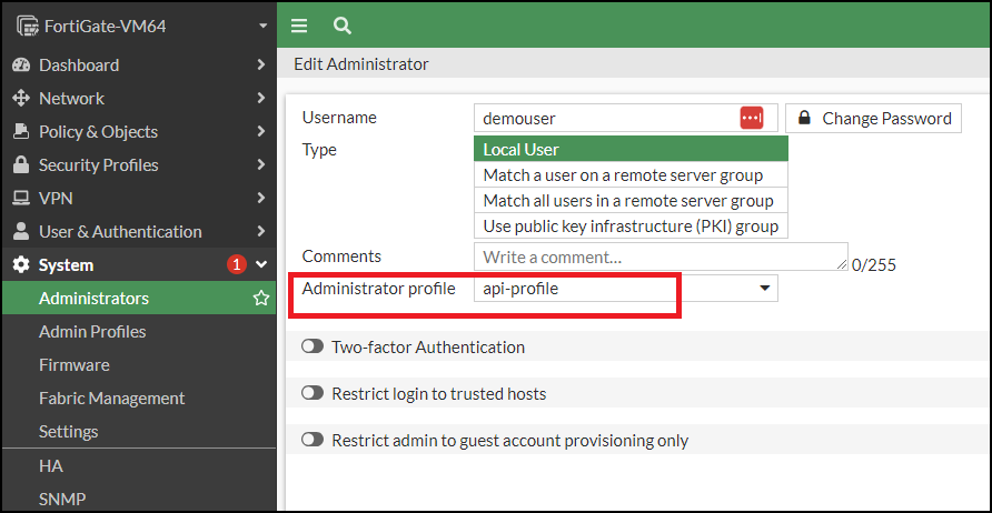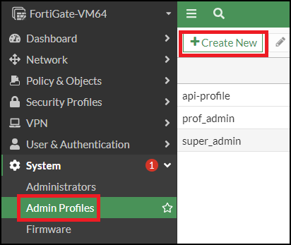 To create an API user, first create an Admin Profile, then create the API user either for a single VDOM or multiple VDOMs.