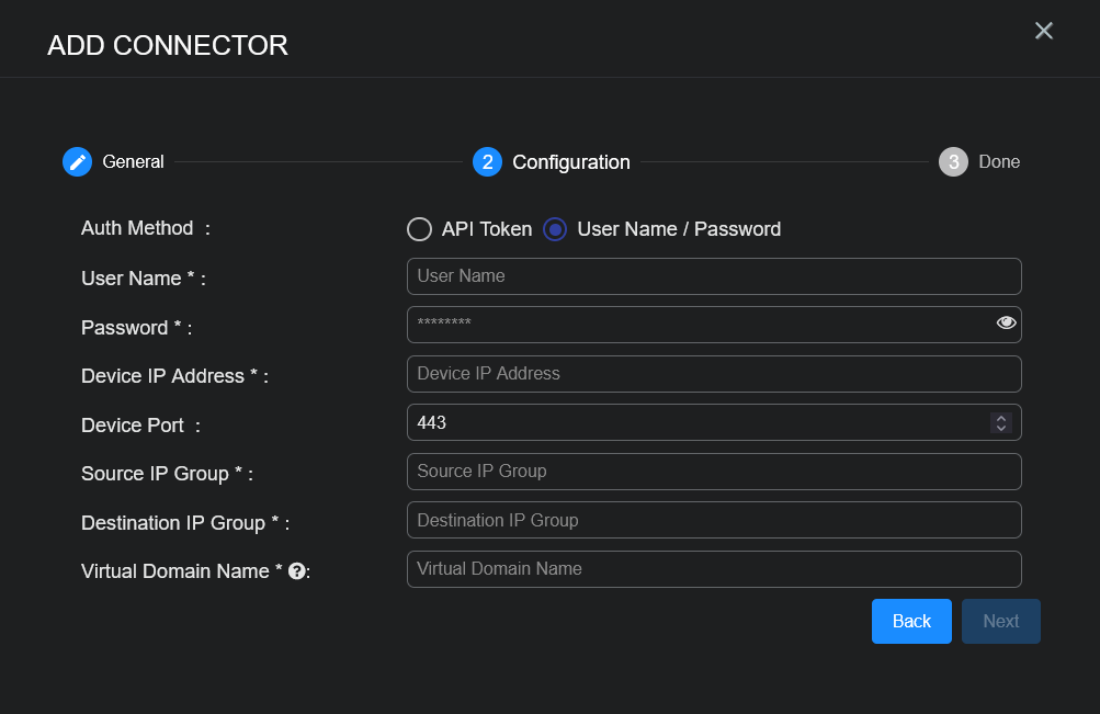 • For API Token Auth Method: API Token, Device IP Address, Source IP Group, Destination IP Group, and Virtual Domain Name
