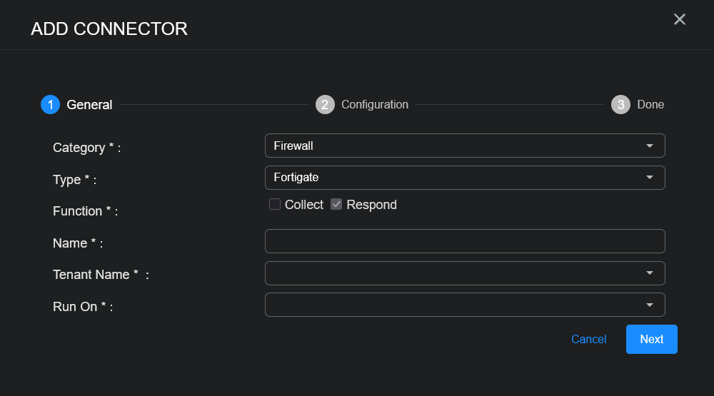 To add a new Fortigate firewall connector in Stellar Cyber: