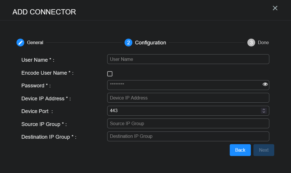 • User Name, Encode User Name, Password, Device IP Address, Source IP Group, and Destination IP Group