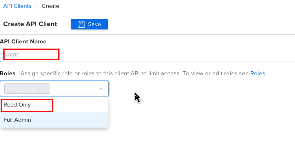 5. Add one or more Roles to configure permissions for the API client (Read Only is sufficient)