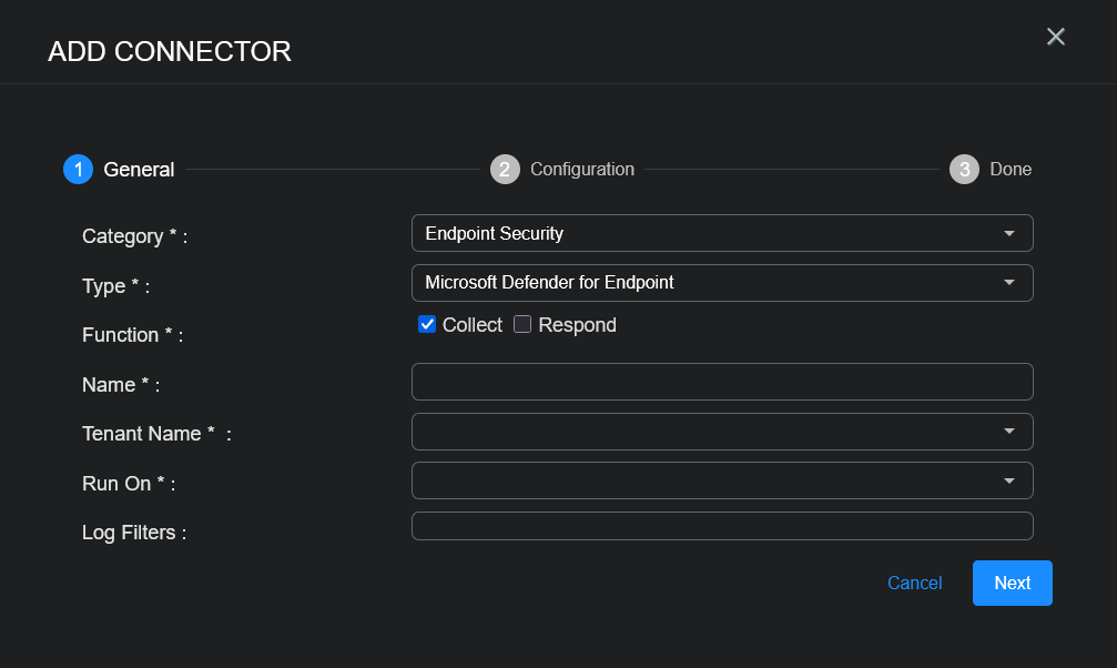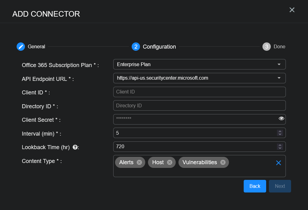 With the access information handy, you can add a Microsoft Defender for Endpoint connector in Stellar Cyber: