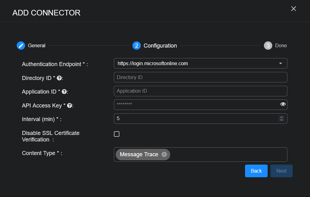 This connector allows Stellar Cyber to ingest logs from Office 365 Reporting Web Service and add the records to the data lake. It integrates with the Microsoft Reporting Web Service to query Message Trace data.