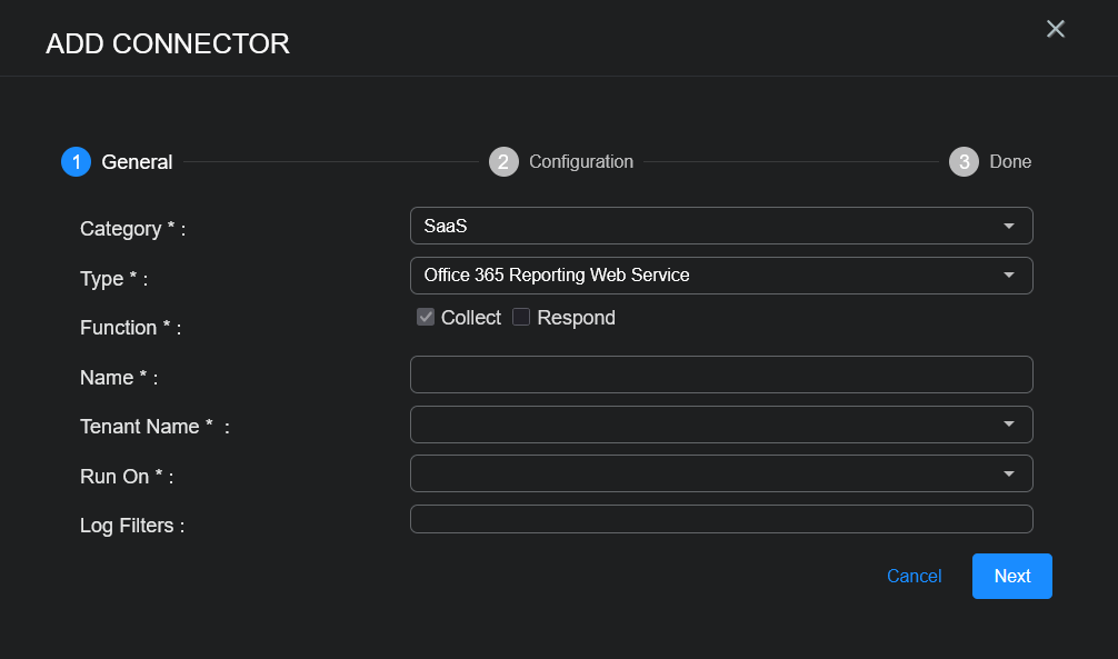 To add an Office 365 Reporting Web Service connector in Stellar Cyber: