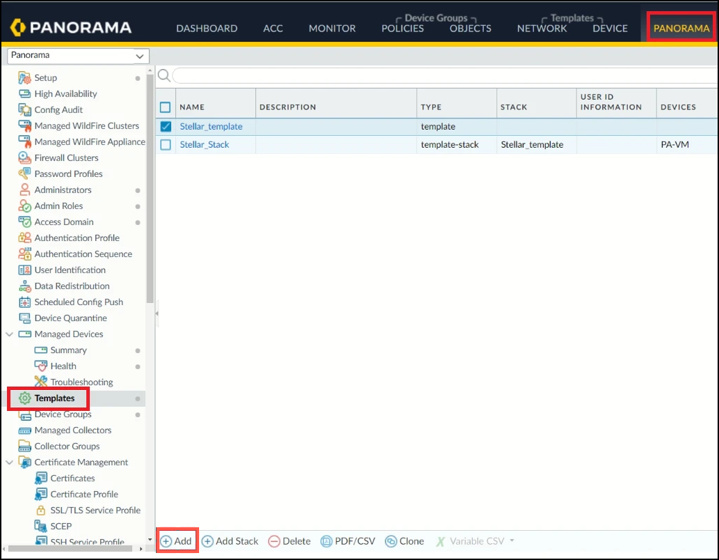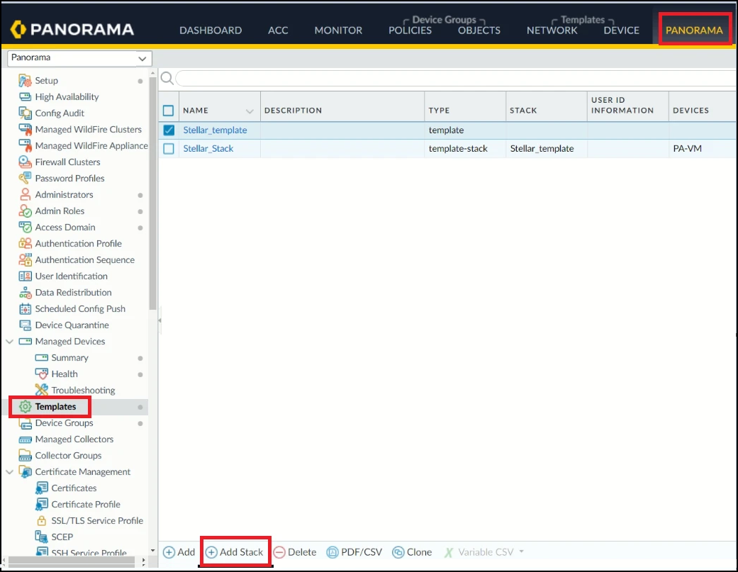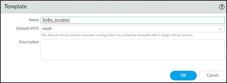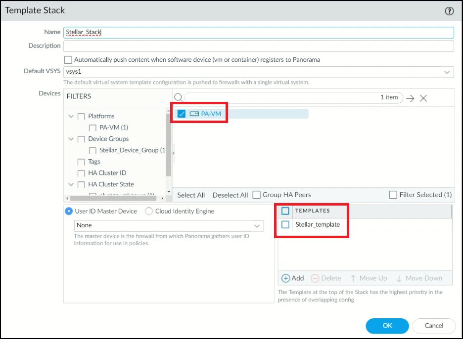7. In the Template Stack screen, enter the Name of the template stack. In this example, it is Stellar_Stack.