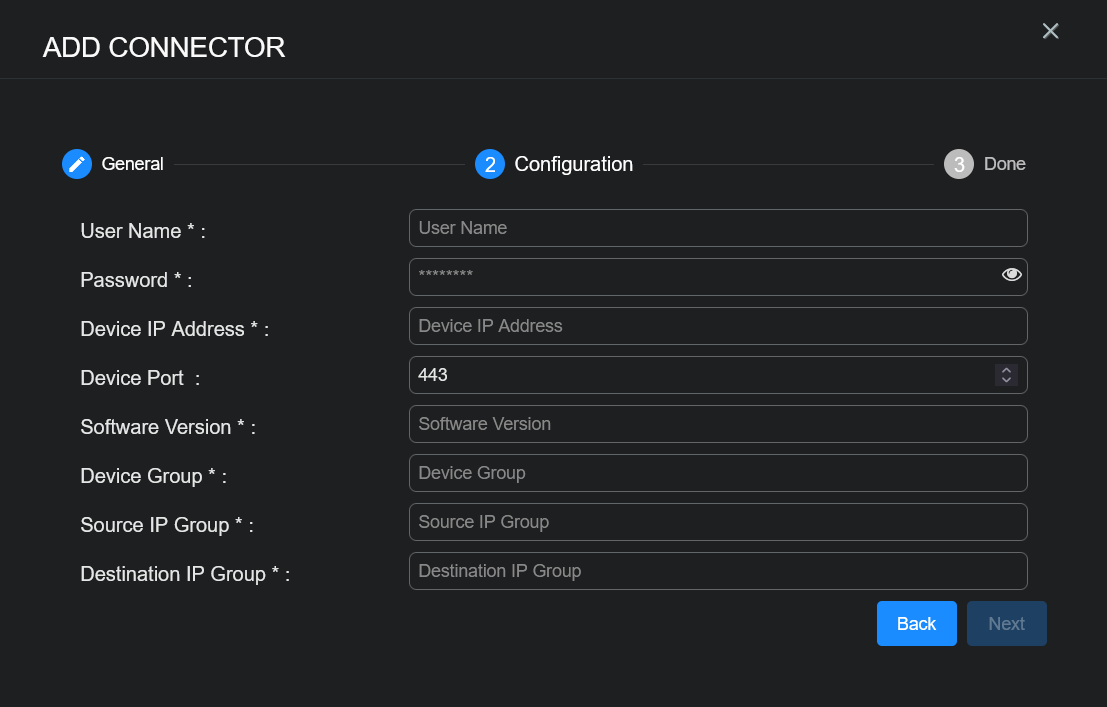 • User Name, Password, Device IP Address, Software Version, Device Group, Source IP Group, and Destination IP Group