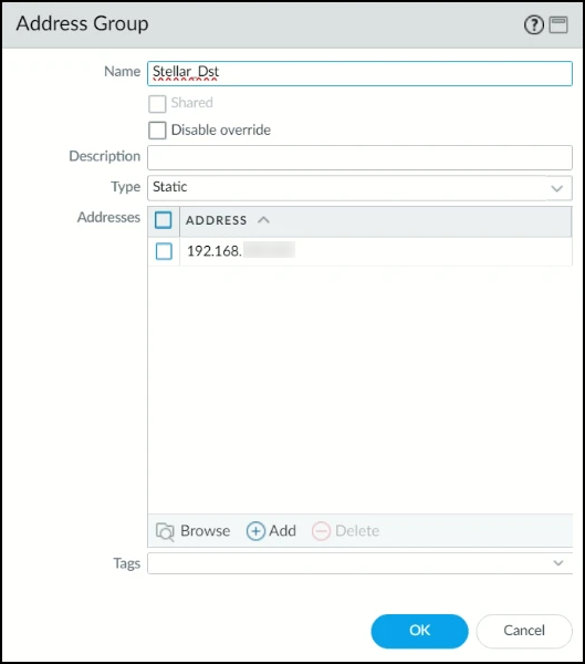 7. In the Address Group screen, enter the Name of the destination address group. In this example, it is Stellar_Dst.