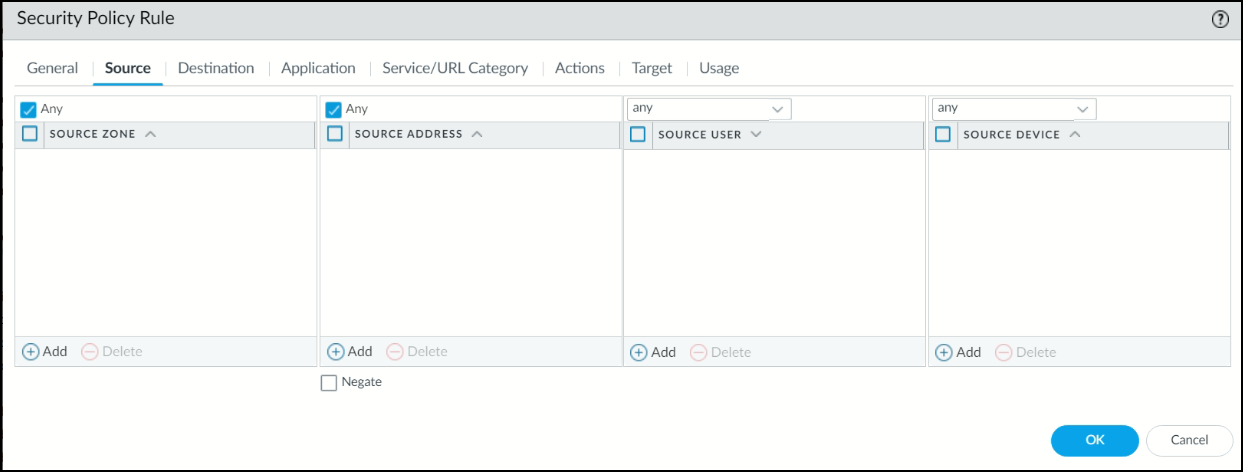 4. Under the Source tab, select Any and then add the source address group. In this example, it is Stellar_Src.
