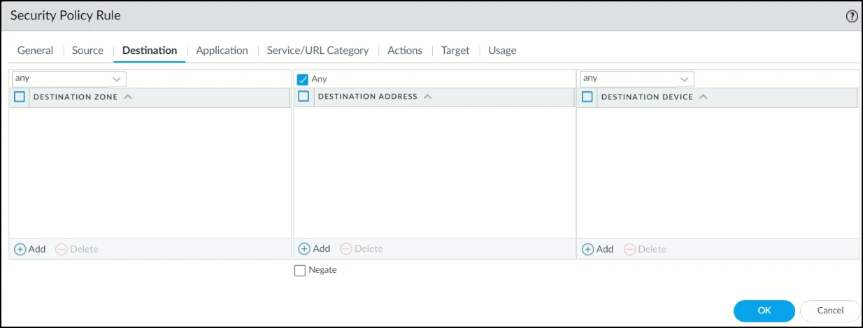5. Under the Destination tab, select Any.
