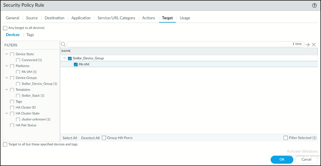 9. Under the Target tab, for the Device Group, select the firewall. In this example, the Device Group is Stellar_Device_Group and the firewall is PA-VM.