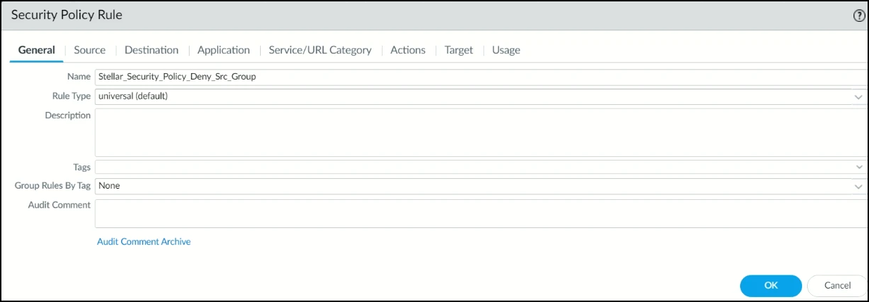 3. In the Security Policy Rule screen, under the General tab, enter the Name of the policy. In this example, it is Stellar_Security_Policy_Deny_Src_Group.