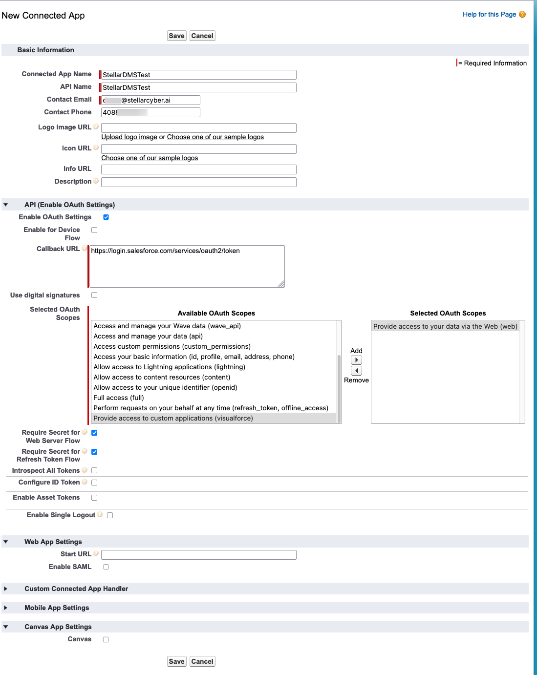 • Callback URL: This is used in Stellar Cyber as the Token Endpoint URL (https://login.salesforce.com/services/oath2/token)