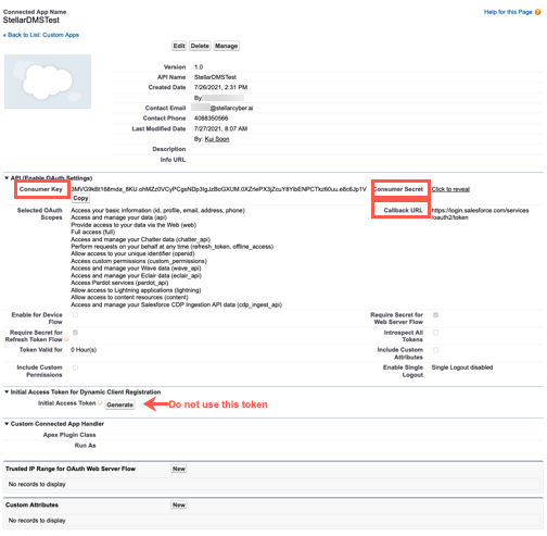 7. The Connect App details screen displays, from where you can now collect the following information: