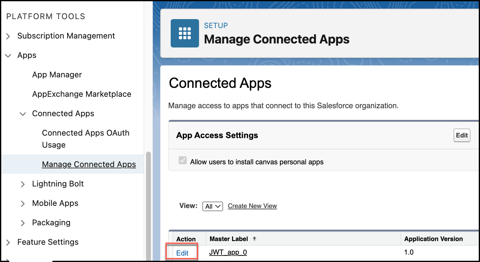 11. Under PLATFORM TOOLS, navigate to Apps > Connected Apps > Manage Connected Apps and click Edit for your app.