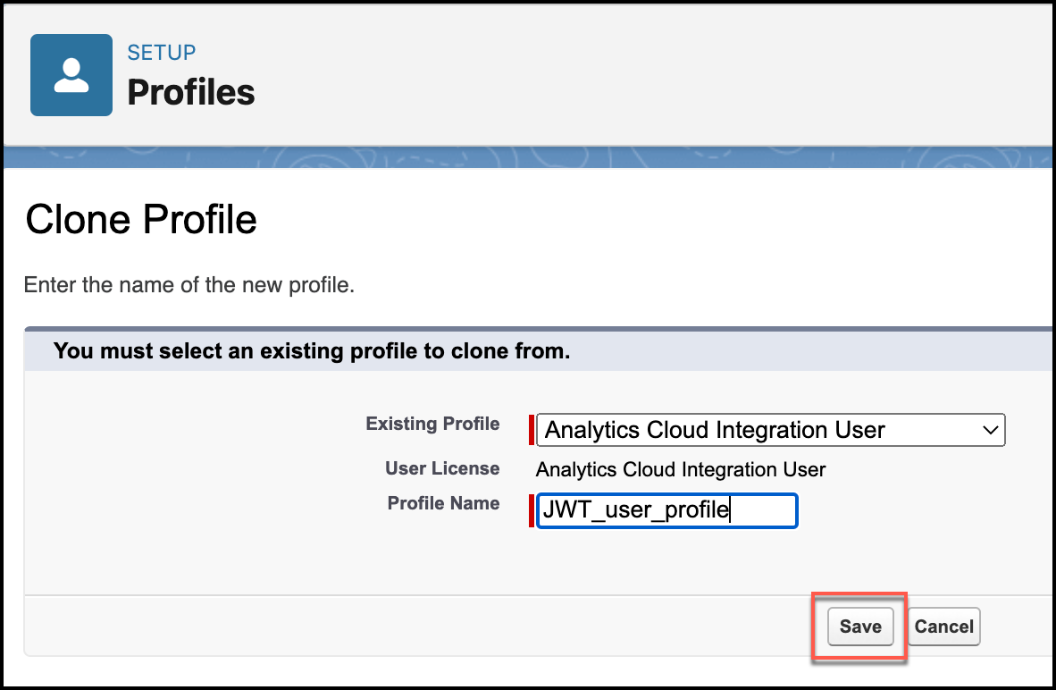2. Select Analytics Cloud Integration User as an Existing Profile to clone from, enter a new Profile Name, and click Save.