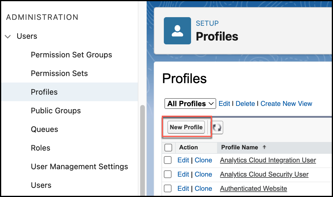 1. Under ADMINISTRATION, navigate to Users | Profiles and click New Profile.
