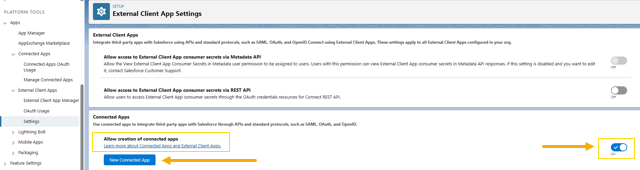 2. Enable the Allow creation of connected apps option and click the New Connected App button.