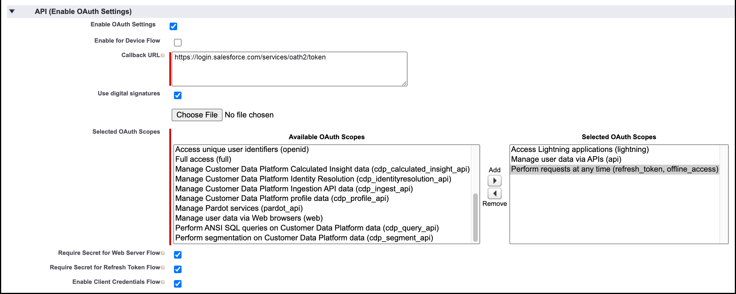 • Check the boxes for Require Secret for Web Server Flow and for Require Secret for Refresh Token Flow